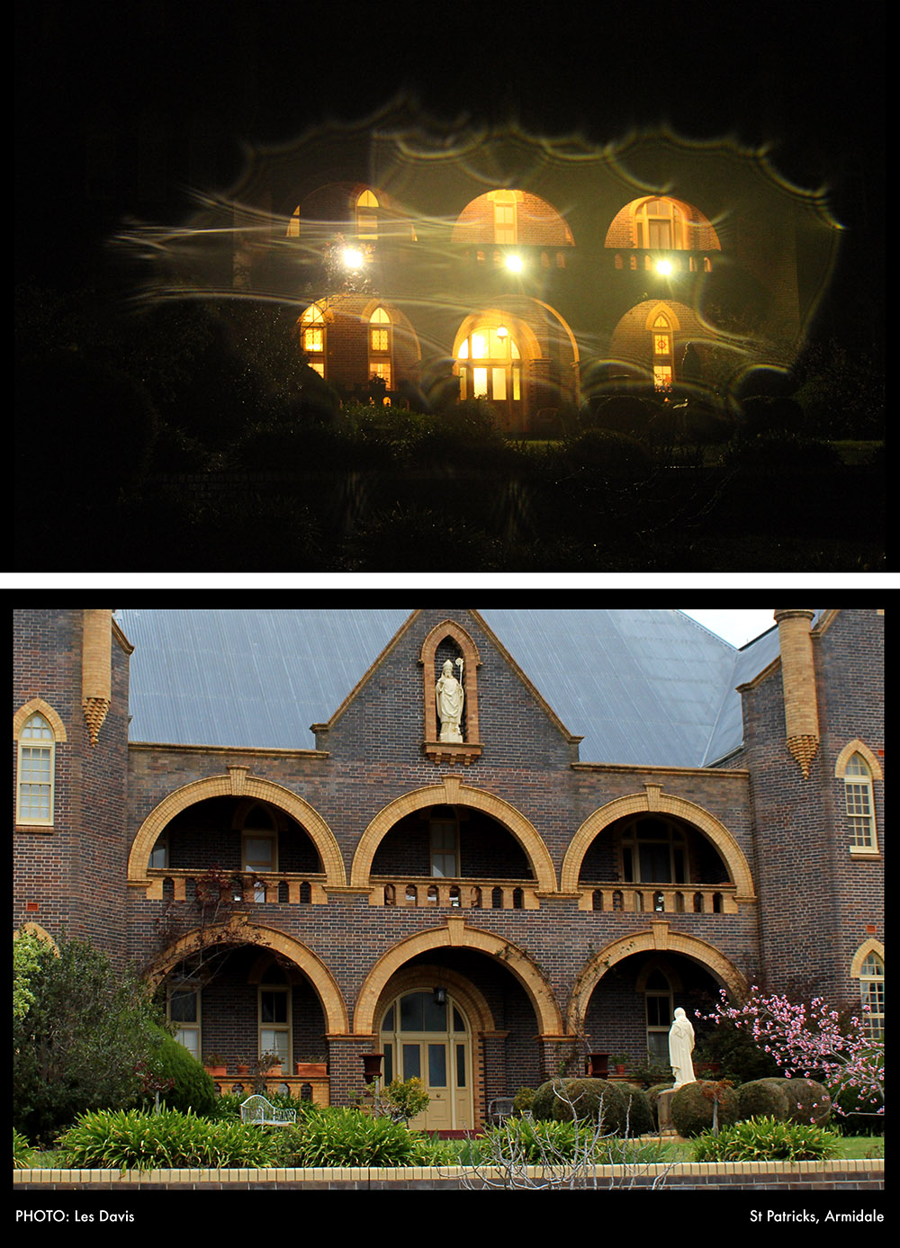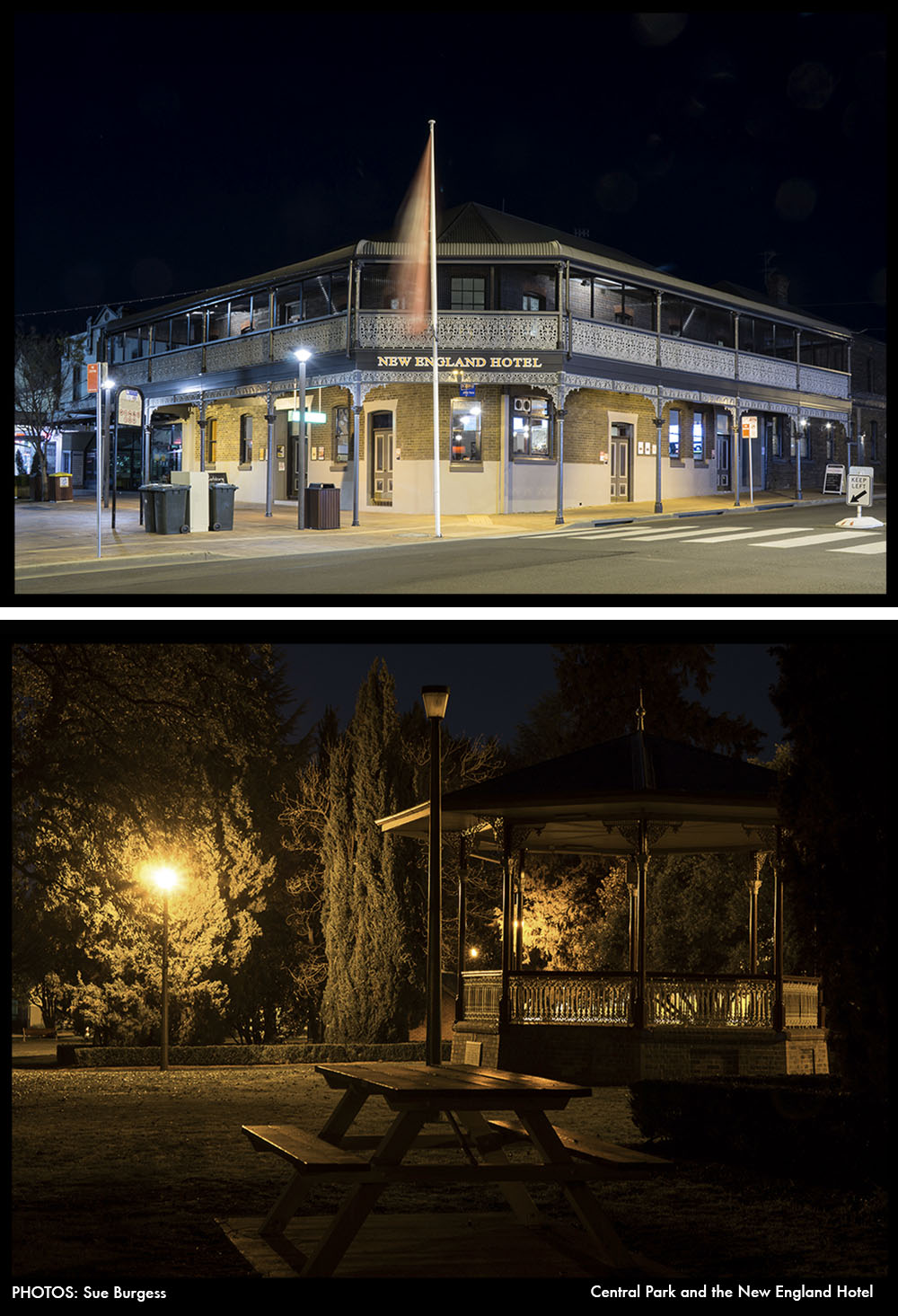 In our latest Nocturne project we worked with a group of photographers from the Armidale region to document the change of light from day to night. The special theme we developed for the Nocturne: Armidale project was to capture the town in both the early evening’s nocturnal light with a second photograph of the subject during daylight. This ‘re-photography’ approach resulted in a comparative pairs of images revealing the evocative nature of nocturne light and how it transforms everyday places.